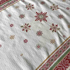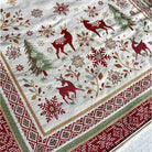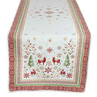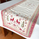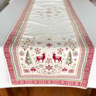 This elegant jacquard table runner brings a touch of classic French charm to your festive table. Made in France using time-honoured techniques, it features a graceful pattern of red and gold snowflakes, reindeer, pine trees, and stylised foliage on a soft winter white background.