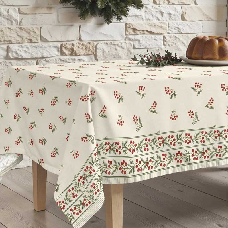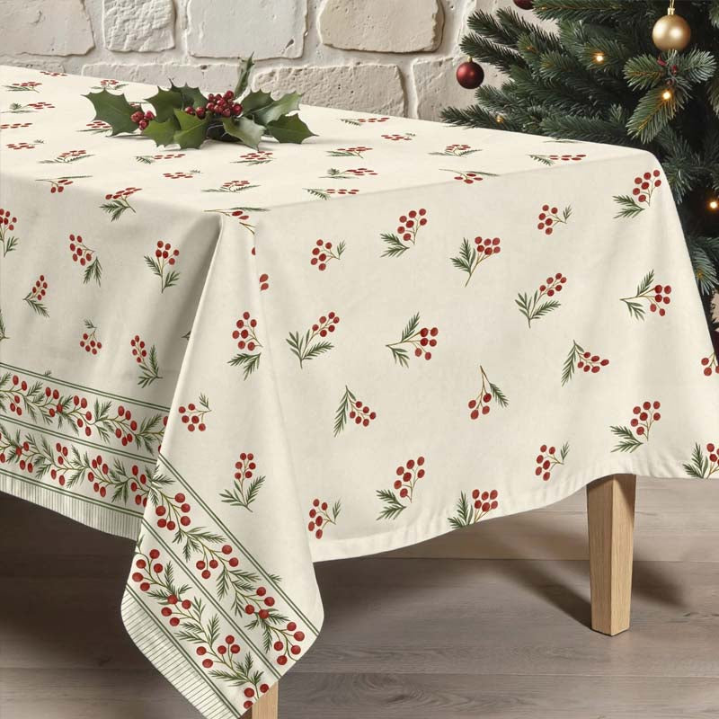 Get ready to celebrate Christmas in style with this beautiful tablecloth. An elegant festive design without being too kitsch or over the top. Your family and friends will feel right at home sitting around this beautiful Christmas Berry tablecloth with a stylish border along the sides.