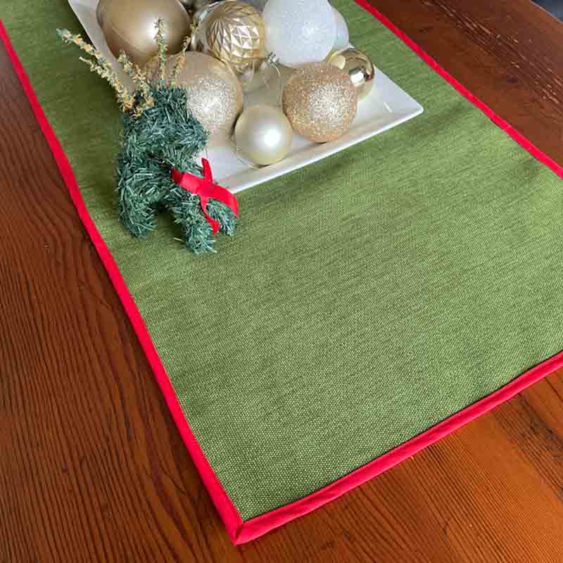 Made from a textured green fabric with a classic red bias trim, it adds a pop of colour to your holiday table without overwhelming. The combination is a subtle nod to traditional Noël colours, but with a clean, modern finish that works with both rustic and contemporary decor. Whether you’re using it beneath your best china or layering it with natural linen and handmade touches, it offers a beautiful base for your festive creativity.