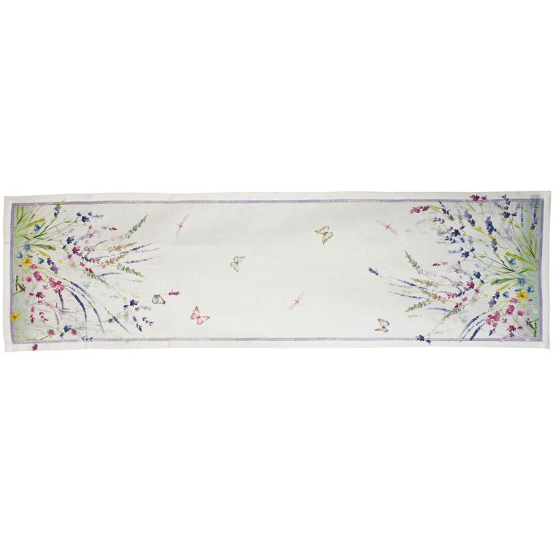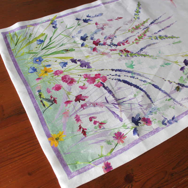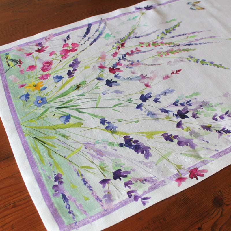 Celebrate the seasons with the Spring linen table runner, blooming with watercolor wildflowers in gentle pinks, purples and greens. Delicate butterflies and dragonflies flit across a creamy background, while each end bursts with clusters of lavender, cornflowers and meadow blooms. It brings the beauty of a quiet spring morning to your table.