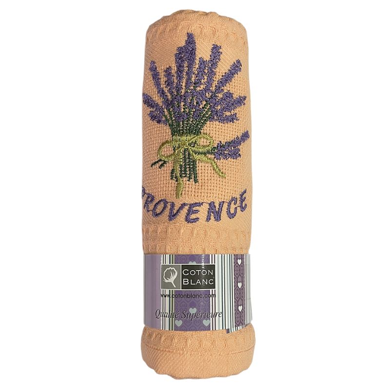 Waffle cotton tea towel with embroidered lavender motif and “Provence” at the bottom.